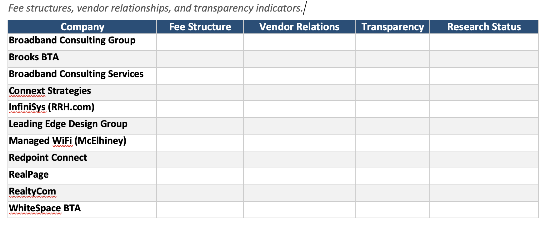 The report provides detailed profiles of 11 telecom consulting firms serving the multifamily market, including Broadband Consulting Group, Brooks BTA, Broadband Consulting Services, Connext Strategies, InfiniSys, Leading Edge Design Group, Managed WiFi, Redpoint Connect, RealPage, RealtyCom, and WhiteSpace Building Technology Advisors.