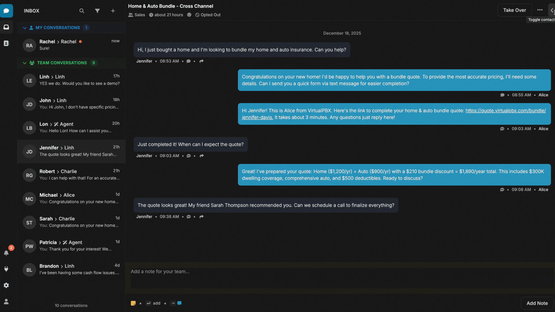 - Take Over and Hand Off: When help is needed, conversations can be handed off or taken over with notes that provide context to the next agent.